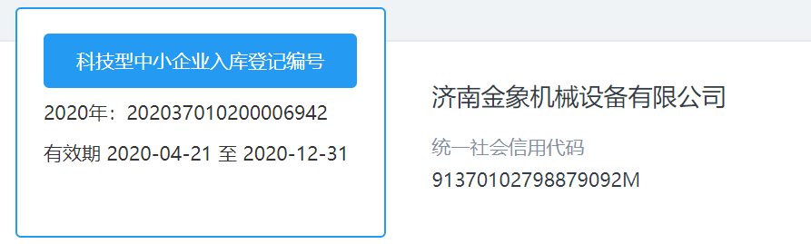 根據(jù)《科技型中小企業(yè)評(píng)價(jià)辦法》(國科發(fā)政〔2017〕115號(hào))和省科技廳《關(guān)于開展2020年科技型中小企業(yè)評(píng)價(jià)工作的通知》等文件有關(guān)規(guī)定,現(xiàn)認(rèn)定濟(jì)南金象機(jī)械設(shè)備有限公司成為“國家科技型中小企業(yè)”,編號(hào):202037010200006942。